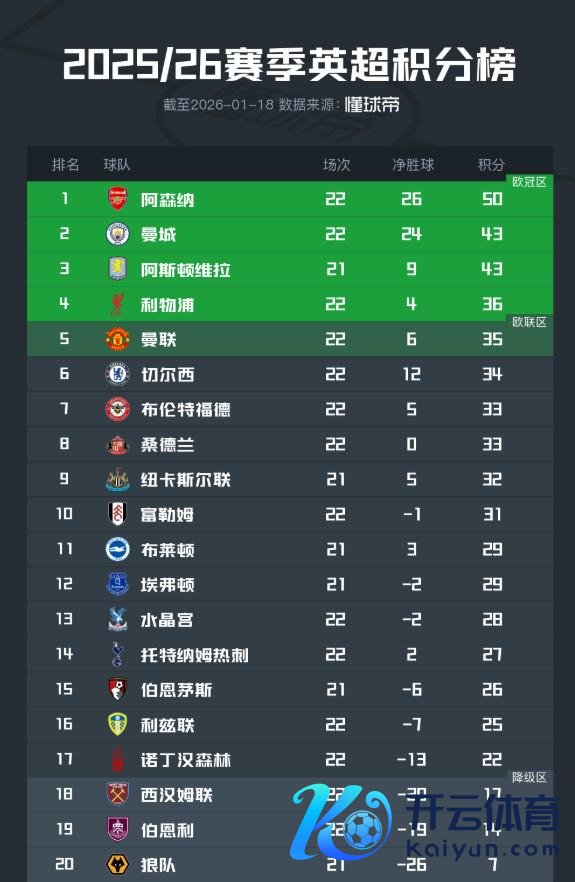 北京技巧1月18日,2025/26赛季英超联赛罢休了第22轮的大部分较量,积分榜的场面也产生了进一步的变化。