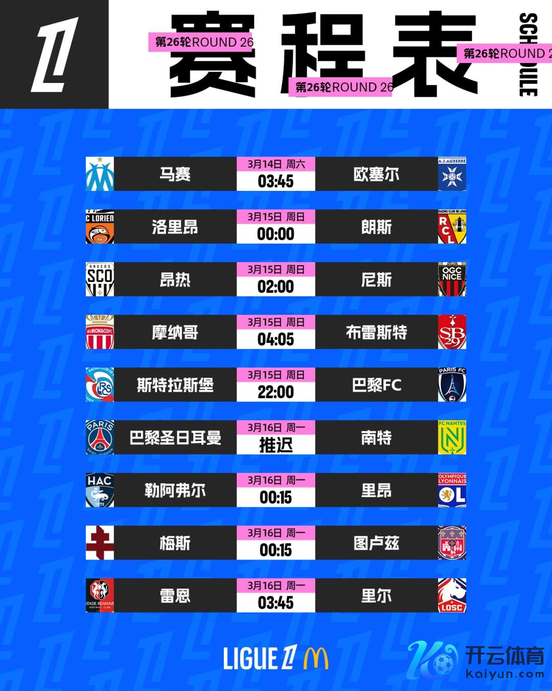 法甲第26轮赛程