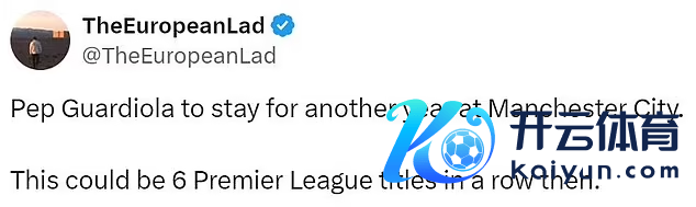 另一位球迷默示:“瓜迪奥拉将在曼城多留一年,也等于说他们要6连冠了。”