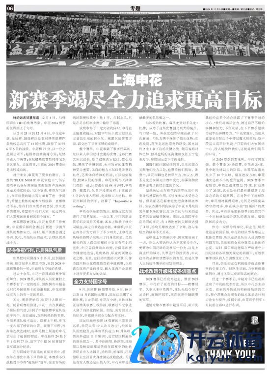 从2月25日到12月4日,申花在中超、足协杯、超等杯以及亚冠精英联赛四条阵线所有这个词打了41场比赛,得回了30胜6平5负的战绩。中超积77分,以一分之差屈居亚军;超等杯投诚海港夺冠;足协杯插足半决赛;亚冠精英联赛暂时名次东亚区第九。总体而言,申花的2024赛季照旧比较告捷的。