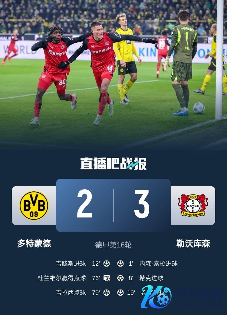 直播吧1月11日讯 德甲第16轮,多特镇守主场伊杜纳信号公园球场对阵勒沃库森。上半场,泰拉开场24秒闪击,希克双响立功,吉滕斯进球。易边再战,希克错失戴帽良机,吉拉西点射立功。最终多特2-3勒沃库森。积分榜方面,勒沃库森先赛距榜首拜仁1分,多特25分第六。