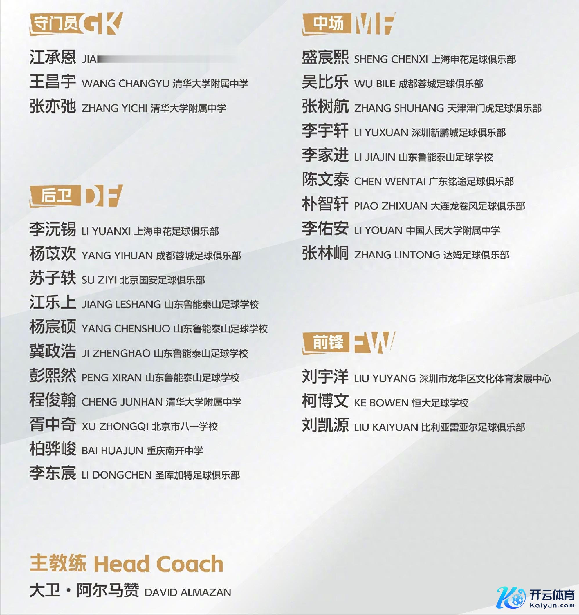 本次名单星光熠熠,刘凯源(比利亚雷亚尔) 领衔锋线,搭配张林峒(达姆)、李东宸(圣库加特) 三位留洋小将,成为最大看点。国内班底以山东鲁能足校(5东谈主)、清华附中(3东谈主) 为中枢,兼顾做事梯队与校园足球东谈主才,结构平衡。
